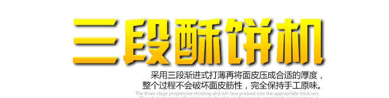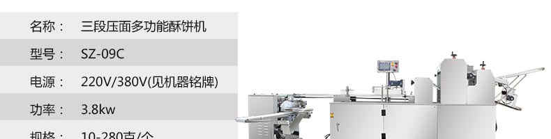 SZ-09C三段壓面酥餅機(jī),生產(chǎn)速度、制品大小、重量、皮餡比例可隨時調(diào)整、變更。適用于蘇式月餅、綠豆餅、老婆餅、蔥油餅、鮮花餅、肉松餅、金華酥餅等。適用于大、中型糕餅生產(chǎn)廠家,免費提供工藝技術(shù)。