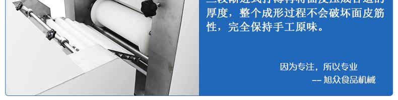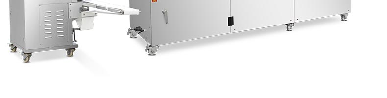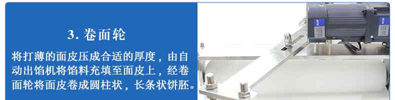 旭眾牌SZ-09C多功能三段酥餅機(jī)采用三段漸進(jìn)式打薄再將面皮壓成合適的厚度。由自動出餡機(jī)將餡料充填至面皮上,經(jīng)卷面輪將面皮卷成圓柱狀,最后以成型刀具切割成球狀。長條狀餅胚,整個成形過程不會破壞面皮筋性,保持手工原味。